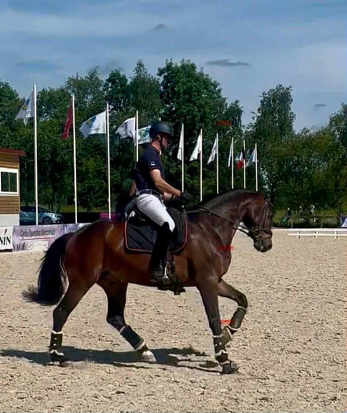 We present to you Apalachee, an 8-year-old Westphalian gelding with a harmonious build and a proud expression, perfectly embodying the promising dressage horse destined for competition. From the very first steps, Apalachee captures attention: his expansive, supple trot with a touch of overreach, his upward and fluid canter, as well as his generous, elastic walk, all reflect the quality of his noble lineage. Standing at 16.1 hands, he displays an elegant and athletic frame while maintaining a balanced, modern silhouette. He comes from a very interesting pedigree: Father: Apache — an internationally renowned KWPN stallion, finalist at the World Championships, known for passing on suppleness, elasticity, and expressiveness in movement. Dam’s sire: Fürst Romancier — a highly regarded Oldenburg breeding stallion, recognized for his quality movement and reliable temperament, producing many high-level competition horses. This carefully chosen pedigree provides him with a solid technical and genetic foundation for an ambitious sporting career. Apalachee is a very kind, human-oriented, and willing horse who shows a genuine desire to perform well. However, he has some temperament and requires a confident, precise rider: without clear guidance, he can show his character and may be a bit selective. When properly managed, this sensitivity makes him a presenceful and committed partner under saddle. Currently, Apalachee competes at Amateur Level 2, with: - solid dressage basics, - changes of lead in progress, - and a real capacity to progress toward higher-level tests. He has been rarely competed, leaving ample room for his future rider to develop a tailored training program suited to his potential. Apalachee is a quality horse, endowed with three beautiful gaits and genuine potential for the highest levels. He will appeal to an experienced rider seeking an elegant, expressive, and engaging partner to develop toward future competitions.