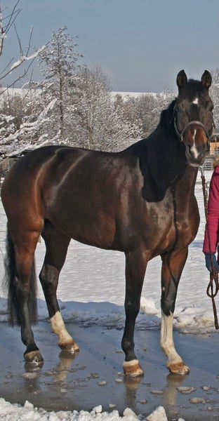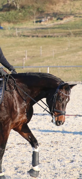 Calimera, known as "Cookie," is a 15-year-old, affectionate mare with her heart in the right place. She impresses with her versatility and very honest character. This makes her the perfect partner for the ambitious leisure rider. She enjoys working a lot and requires varied movement. In dressage, she has completed some M-level lessons, and she has also been jumped weekly up to L-level. She goes out into the field without any issues, both alone and in groups, and is absolutely uncomplicated when away from home. She is very people-oriented and gives her all for her trusted person. She wants to please but needs a sensitive, experienced rider who can lead her clearly yet kindly. She is not a pure beginner's horse. Cookie will only be placed in the very best hands. A desire for a well-behaved and motivated riding horse is essential. Cookie is located in the Stuttgart area. I am happy to send videos and further information upon request.