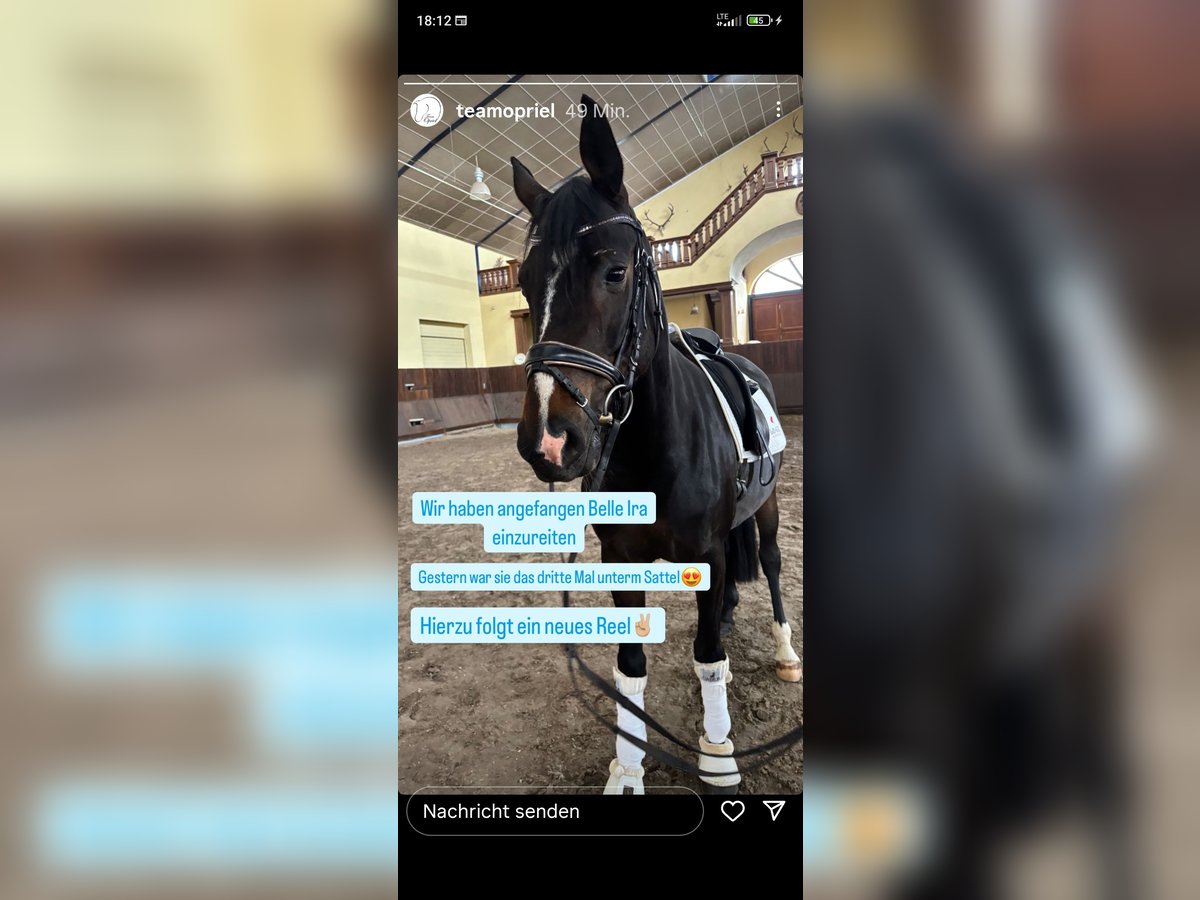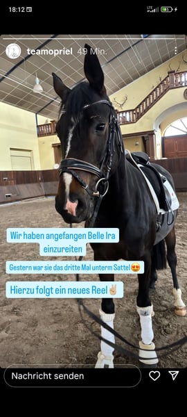 Ich biete eine sehr gut veranlagte 5 j. Stute an, die eine gute Wachstums- und Entwicklungszeit hatte. Inzwischen ist sie schonend und sicher Eingeritten, ist absolut brav unter dem Sattel und zeigt große Qualität. Die Stute deckt auch größere Reiter*innen sehr gut ab und hat zusätzlich noch ein für Zuchtinteressierte sehr gute Papiere. Bohemianx Sandro Hit Die Stute benötigt einen Menschen, der Interesse an der weiteren Ausbildung und Förderung eines Dressurnachwuchspferdes hat, sie ist kein Anfängerpferd!