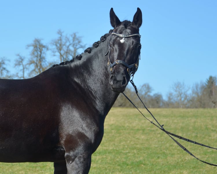 Zum Verkauf steht hier eine bildschöne Rappstute mit viel Qulität und Eleganz. Sie ist eine Enkelin von Totilas und Donnerschlag und verfügt über beste Anlagen für die höheren Klassen der Dressur. Sie punktet durch 3 sehr gute Grundgangarten und ein hohes Maß an Leistungsbereitschaft und Sensibilität. Ich habe sie 5 jähr. vom Züchter gekauft und angeritten. Seitdem hat sie eine korrekte und vielseitige Ausbildung genossen. Sie ist longiert, kennt Stangen, Cavalettis und kleinere Sprünge. Sie läuft jetzt auf L-Niveau und wird täglich besser. Auf Grund ihrer Sensibilität und Charakterstärke, sucht sie eine erfahrene, geduldige und feine Reiterin, die ihre Qualität zu schätzen und zu fördern weiß. Ein AKU liegt noch nicht vor.