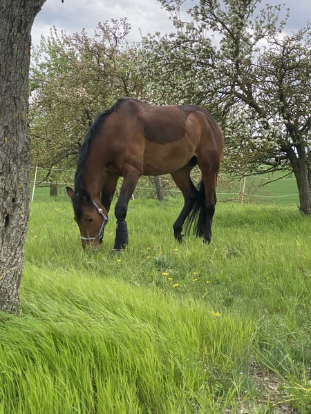 Nach ganz großer und sehr schwerer Entscheidung habe ich mich entschieden meinen 14 Jährigen Württemberger Wallach Harald zu verkaufen. Harald ist seit 2024 in meinem Besitz. Er hat ein Stockmaß von 186cm. Bei seinem Vorbesitzer der ihn von Fohlen an hatte, lief er bis zur Dressur Klasse L. Bei mir wurde er nur im Freizeitbereich geritten und von meiner ehemaligen Reitbeteiligung auf einem A Dressur Turnier vorgestellt. Seine Lektion kann er ohne wenn und aber, man muss ihn aber reiten können. Er ist ein großer Schmusebör und liebt es verwöhnt zu werden. Sein Vorworts Gang suchen wir öfters vergeblich. Er ist eher der gemütliche beim reiten. Im Gelände ist er auch eher der ruhigere. Er hatte sich Anfang 2024 das Unterstützungsband angerissen was aber mittlerweile komplett verheilt ist. Dies wurde damals alles tierärztlich geklärt und behandelt. Harald steht seit September 2024 in einem Aktivstall mit 23 anderen Pferden, Wallach und Stuten zusammen. Harald ist 4 Fach beschlagen, wurde regelmäßig auch der Physio vorgestellt. Impfungen und Zähne wurden regelmäßig gemacht. Ich möchte Ihn definitiv nicht an jemand verkaufen, wo er als Sportgerät dienen soll. Zubehör sollte mit erworben werden für 1500€ Sattel wurde erst frisch gepolstert.