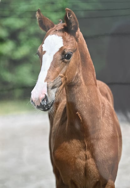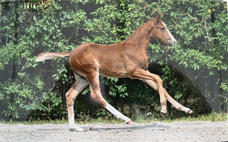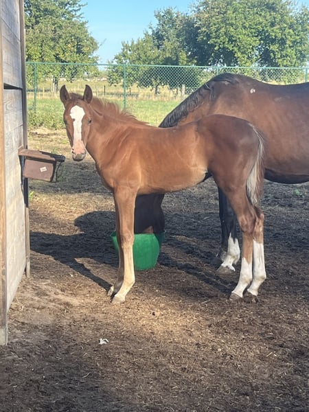Jaarling hengst Ermitage Kalone X Lupicor X Burggraaf X Uppercut Xx Heel mooie, brave jaarling hengst, van Ermitage Kalone, te koop Moeder heeft zelf 1m35 gesprongen, had de kwaliteit om meer te lopen, maar door blessure uit de sport gehaald Moederlijn heeft meerdere internationale springpaarden gegeven, waaronder Daddygold, Vicky-Gold, Audi’s Dimple, Diamogold, … Foto’s zijn van vorige zomer