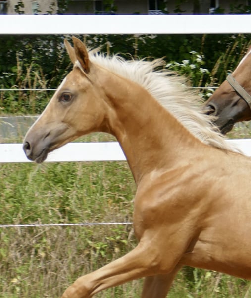 Miranda A "die Bewundernswerte" - absolut überzeugender Nachwuchs in blond von Michelangelo aus der Iphigenia von Ismo (Ilasso x First Gotthard x Zeus). Bewegungsstark und sportlich, anschauen und verlieben! Für alle Sparten offen, hochinteressant für Vielseitigkeit und Springsport! Bild Palomino am Sprung ist eine 4j. Vollschwester, Video freispringen der Mutter