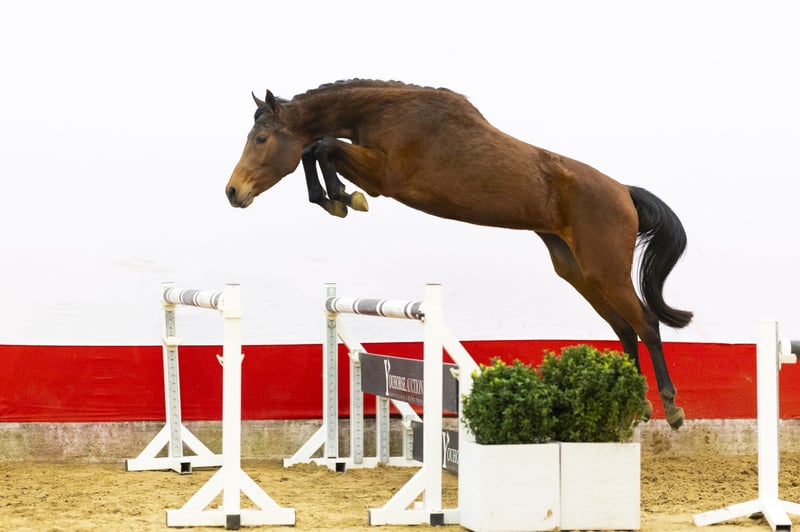 Beautiful 3-year-old mare with a modern type and plenty of blood. She already jumps with confidence and shows that she understands her job. She is light-footed, quick off the ground and demonstrates a very good jumping technique. Her take-off is fast and efficient, and she stays well balanced over the fence. She finishes the jump with ease. In movement she is light and easy to ride. The engine is always on. A true blood-type sporthorse with energy and mindset.