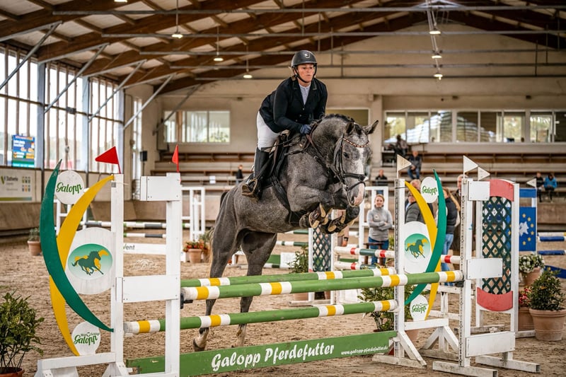 Diese 4-jährige Schimmelstute überzeugt durch ihren modernen Typ, ihr überdurchschnittliches Springvermögen und ihre sehr gute Übersicht am Sprung. Mit ihrer leistungsstarken Abstammung – Dominator x Lord Pezi – bringt sie alles mit, was ein zukünftiges Sportpferd auszeichnet: Vorsicht, Kraft und Intelligenz. Sie wurde altersgerecht und mit Bedacht ausgebildet. In ihren ersten Springpferdeprüfungen zeigte sie sich mutig, lernwillig und konzentriert, ist dabei aber – ganz altersentsprechend – noch ausbaufähig in Balance und Routine. Mit weiterer Förderung wird sie sich sicher zu einem zuverlässigen Sportpartner entwickeln. Auch in der Dressurarbeit präsentiert sie sich auf dem Niveau einer Dressurpferde-A-Prüfung, mit taktsicheren Grundgangarten, einer guten Anlehnung und sportlichen Arbeitseinstellung. Im täglichen Umgang ist sie brav, menschenbezogen und unkompliziert. Sie kennt sowohl Boxenhaltung als auch Paddockboxen und zeigt sich auch im fremden Gelände wenig beeindruckt. Das zeichnet sie aus • Vermögend und vorsichtig am Sprung • Gute Übersicht und natürliche Springintelligenz • Rittig, fein zu reiten und ehrlich im Charakter • Dressurmäßig solide ausgebildet • Erste Springpferdeprüfungen absolviert, Potenzial zur Weiterentwicklung deutlich erkennbar • Aktuelle Röntgenbilder vorhanden – können bei ernsthaftem Interesse digital übermittelt werden. Eine hochinteressante Nachwuchsstute für ambitionierte Reiter, die Freude an der Ausbildung junger Pferde haben und ein echtes Zukunftspferd suchen. Mit Geduld, Zeit und gezielter Förderung wird sie sich zu einer verlässlichen Sportpartnerin entwickeln – und ist aufgrund ihrer Abstammung auch für die Zucht interessant.