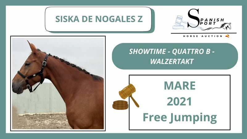 SPANISCHES SPORTPFERDE-AUKTION Vom 20. bis 22. November! Siska de Nogales Z ist eine Stute, die viel Blut und Qualität in ihren freien Springen zeigt. Sie hat einen sehr ausgeglichenen Galopp. Ihr Vater "SHOWTIME" hat auf internationalen Prüfungen bis 1,60 m erfolgreich teilgenommen! Obwohl ihre Nachkommen noch jung sind, zeigen sie ausgezeichnete Eigenschaften im Springen über Hindernisse.