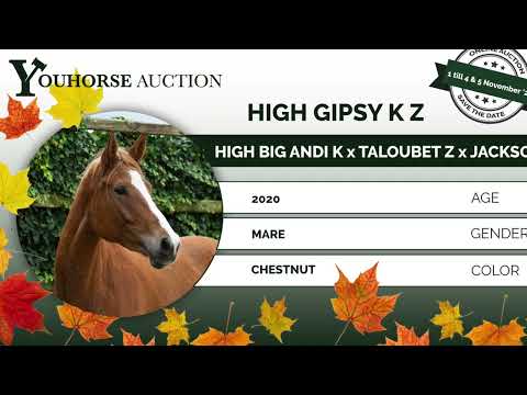De vijfjarige High Gipsy K Z is een opvallende springmerrie met haar blonde manen en staart, maar ook vanwege haar vermogen en voorzichtigheid. De afstamming is bijzonder: Taloubet Z x Taloubet Z. Vader (en grootvader) Taloubet Z sprong op topniveau met Christian Ahlmann en won zelfs de wereldbekerfinale. Hij is bovendien de halfbroer van Nadal Hero & DB (1.60m GP) en Big Star jr KZ (1.55m GP). Taloubet Z nakomelingen op 1.60m niveau zijn Aloubet KV, Taloubetdarco K Z en Tabalou PS. Zijn goedgekeurde zoon Take a Chance on Me Z is zelfs 1.65m GP gestart. Moeder Taloubet’s Gipsy K (Taloubet Z x Jackson x Nimmerdor) sprong internationaal op 1.30m niveau en is een halfzus van twee 1.30-1.35m springpaarden. Het gaat hier om dezelfde stam als olympisch kampioen Big Star. Dit paard komt uit de stal van één van de beste fokkers van Nederland, die zelfs tot KWPN fokker van het jaar werd gehuldigd. Taloubet en Big Star behoren tot zijn bekendste fokproducten. De paarden uit deze fokkerij zijn opgegroeid in alle rust en ruimte, hebben in kuddeverband in de weides gelopen en alle tijd gekregen om zich natuurlijk te ontwikkelen. Er is nog nooit met hen getraind – ze zijn enkel halstermak – en komen dus rechtstreeks uit de opfok. Dat maakt ze bijzonder interessant voor wie zelf een jong paard naar eigen inzicht wil opleiden. Ze zijn eerlijk, onbedorven en zuiver gefokt, rechtstreeks uit de hand van een gerenommeerde fokker.
