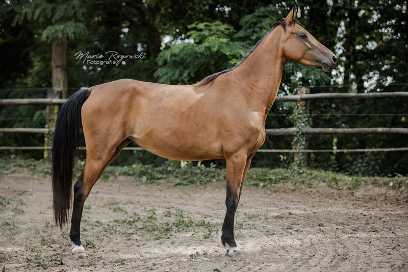 Stute | Zangersheide | Buckskin | geb. 2020 | aktuell 157 cm BUTTERFLY Z ist eine auffällige, sportlich gebaute Stute in seltener Buckskin-Farbe mit exzellentem Bewegungspotenzial. Ihre federnden, taktsicheren Grundgangarten lassen auf eine Zukunft im gehobenen Reitsport schließen - ob Vielseitigkeit, Dressur oder Springen. Vater Bezant stammt aus leistungsgeprüften internationalen Linien mit Schwerpunkt Spring- und Vielseitigkeitssport. Die Mutter Melisande GF ist selbst sportlich veranlagt, überzeugt mit sehr guter Bewegung und ist bereits als zuverlässige Mutterstute bewährt. Butterfly Z verbindet sportliches Talent mit Sonderfarbe und interessanter Abstammung - ideal für Reiter:innen mit Perspektive oder zur Weiterzucht.