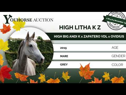 De zesjarige High Litha K Z is nog groen, maar toch de moeite waard om op te leiden. Kijk eens met hoeveel afdruk ze springt en voorzichtig wil zijn. Een merrie met fijn bloed. Vader High Big Andi K is een AES-hengst op 1.55m Grand Prix niveau met Michael Greeve. Hij komt uit dezelfde lijn als de bekende Mr. Itt (1.60m Grand Prix met Eric Willems Geeroms), die op negenjarige leeftijd al de Grote Prijs van Malmö won. Moeder Falitha M stamt af van Zapatero VDL (1.60m Grand Prix). Grootmoeder Alitha (Ovidius x Maykel) is een halfzus van twee 1.30m springpaarden. Nauw verwant is het CCI2* eventingpaard Gentle Genius. Dit paard komt uit de stal van één van de beste fokkers van Nederland, die zelfs tot KWPN fokker van het jaar werd gehuldigd. Taloubet en Big Star behoren tot zijn bekendste fokproducten. De paarden uit deze fokkerij zijn opgegroeid in alle rust en ruimte, hebben in kuddeverband in de weides gelopen en alle tijd gekregen om zich natuurlijk te ontwikkelen. Er is nog nooit met hen getraind – ze zijn enkel halstermak – en komen dus rechtstreeks uit de opfok. Dat maakt ze bijzonder interessant voor wie zelf een jong paard naar eigen inzicht wil opleiden. Ze zijn eerlijk, onbedorven en zuiver gefokt, rechtstreeks uit de hand van een gerenommeerde fokker.