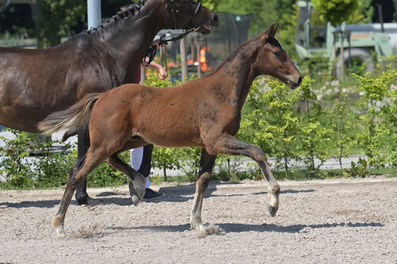 This beautiful and very correctly built dressage stallion was born on March 10, 2025. He is an embryo transfer foal from the famous Vitalos. The mother of the foal, Quality Time, is 10 years old this year and is an Oldenburg elite mare - Pedigree: Quantensprung/Placido. Quality Time has been successfully competing in dressage for years and has won all competitions in 2025 so far, achieving scores of 69-70% in M**, S*, and S** classes. She is currently nearly ready for S*** and will make her debut at this level this season. Quality Time was also qualified for the Bundeschampionat as a 5-year-old. With this beautiful and talented stallion foal, you are securing the future! The sale is directly from the breeder. The mother is also with us and can be viewed. !! The mare that the foal is at foot with is not the genetic mother but a surrogate mother. The ridden black mare in the videos/pictures is the genetic mother. Additionally, we are selling a full sister to this foal, born on March 23, 2025.
