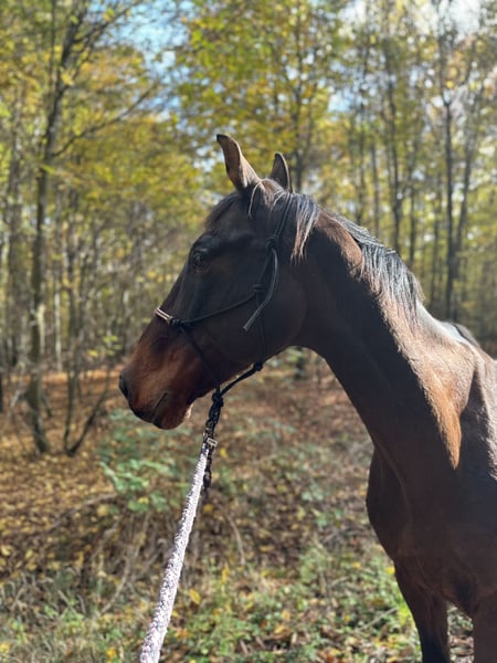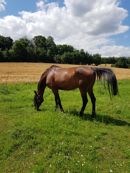 I am reluctantly looking for a loving new home for my 19-year-old gelding as a companion horse. He is well-behaved during grooming, for the farrier (he is barefoot but is also familiar with shoes), and he loads into the trailer without any issues. He is unflappable and is used to dogs, children, large machinery, busy roads, and bridges. He is no longer ridden but enjoys walks (preferably accompanied by another horse) and groundwork. He also enjoys lunging, especially with pole work. He suffers from chronic bronchitis, which he has had for several years and has never been a major problem. This summer he has been coughing a bit, which could be related to the change of barn. Inhalation is possible but not strictly necessary – I could sell an inhaler if needed. Otherwise, no other illnesses are known. For the past year, he has mostly been out on pasture and has only been lunged or taken for walks occasionally. For his future, I wish for him to have a place in a paddock or on a large pasture with horse friends, occasional exercise, attention, and loving care. Home before price; he will only be given to the very best hands. If you are interested or need further information, I look forward to hearing from you.